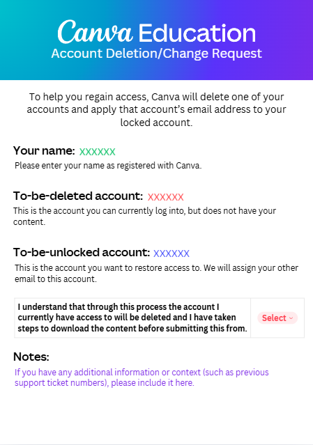 2. Fill out this form (to-be-deleted account is the new account that the user currently has access to & to-be-unlocked account is their previous email address that they want to regain access to)